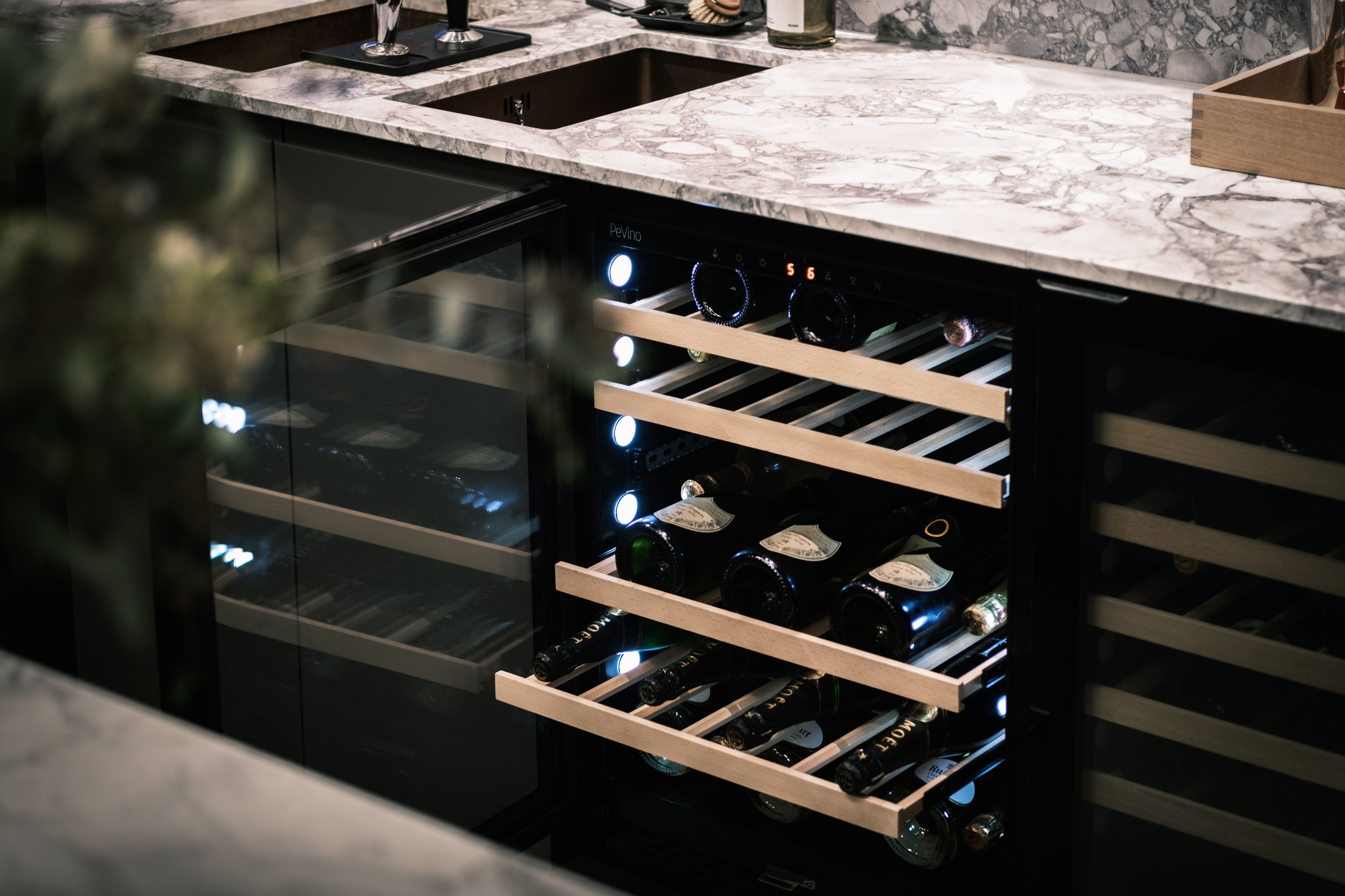 En vinlounge skabt med de elegante Pevino vinkøleskabe