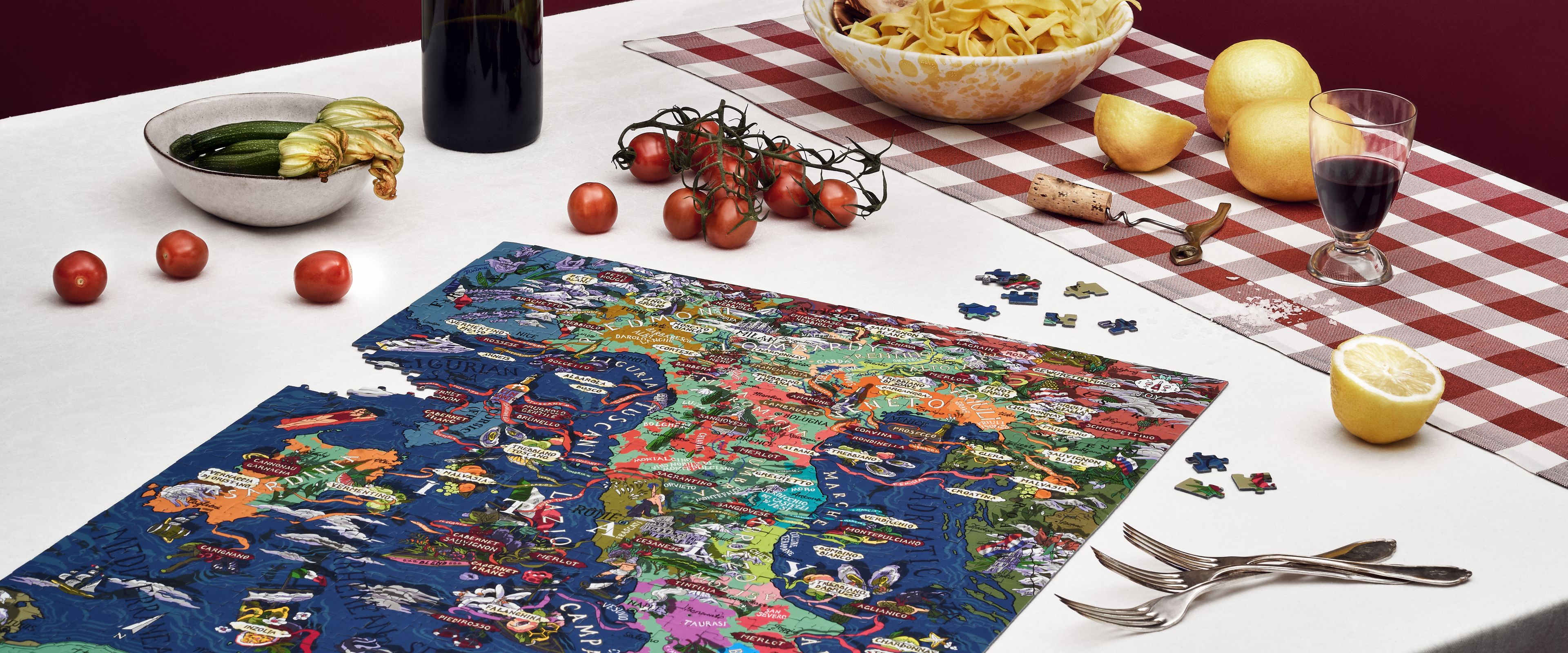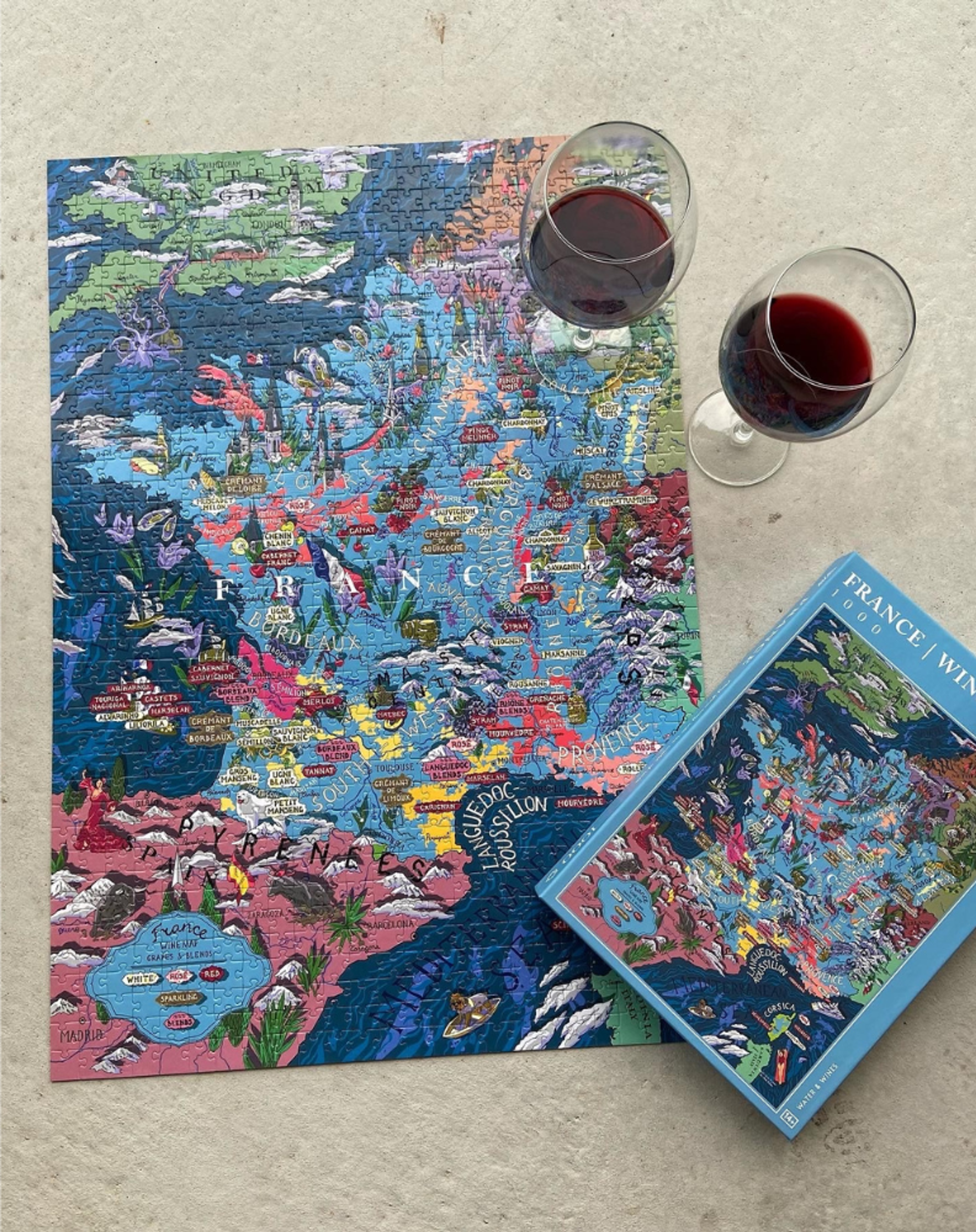 Der er ingen som siger, at du skal bruge begge hænder til at lægge et puslespil (bevares, det kan tage lidt længere tid), så hvorfor ikke gøre det med et glas vin i hånden? Og når du nu er i gang, kan det jo passende være et vinrelateret puslespil.