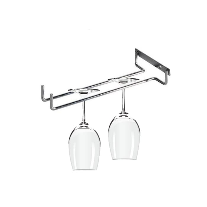 Rustfrit stål vinglasophæng med en enkelt skinne, der kan monteres på vægge, skabe eller under hylder. Modulært design tillader flere enheder for øget opbevaring. Ideel til tilpasset glasudstilling.