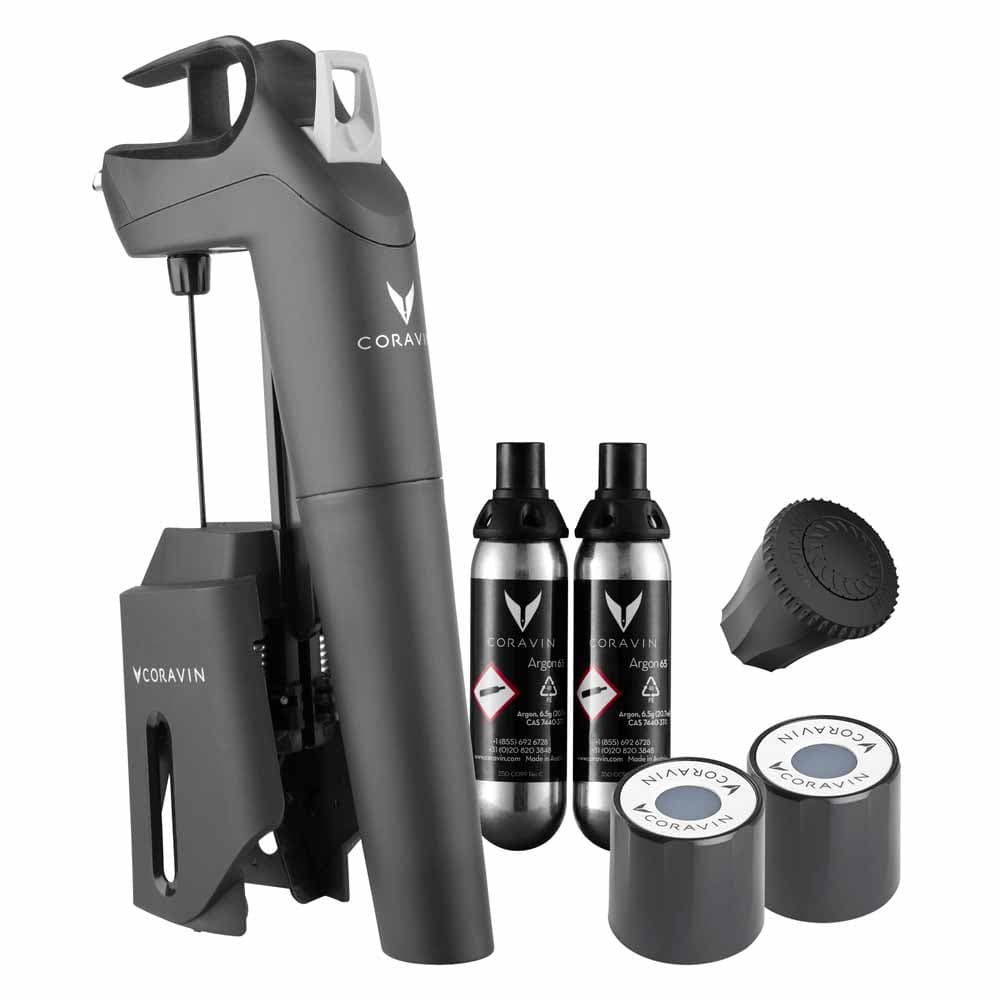 Inkluderer Coravin Model Timeless Three+, 2 stk. Coravin Pure™ Argongaspatroner, 2 stk. CoravinTM Screw Caps og 1 stk. CoravinTM Aerator.