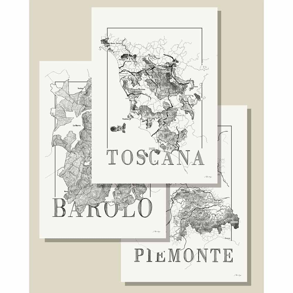 Flotte kunstplakater med motiver af tre af de bedste vinområder i Italien: Barolo, Piemonte og Toscana. Få dem alle tre i en samlet pakke som dekoration i stuen eller køkkenet, eller som inspiration til den næste vinrejse.