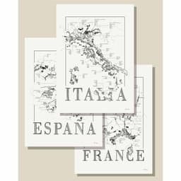 Flotte kunstplakater med motiver af tre af de bedste vinlande i Europa: Frankrig, Italien og Spanien. Få dem alle tre i en samlet pakke som dekoration i stuen eller køkkenet eller som inspiration til den næste vinrejse.