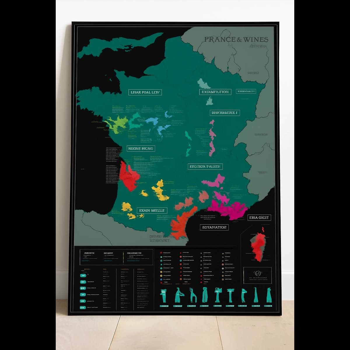 Denne franske vinplakat fremhæver landets vigtigste vinproducerede regioner. Frankrig har et ry for at være verdens førende indenfor god vin, og hver enkelt region er kendt for deres specifikke sorter af vin. Denne plakat er det pefekte valg til vinelskeren, der vil udvikle sin vinviden med stil.