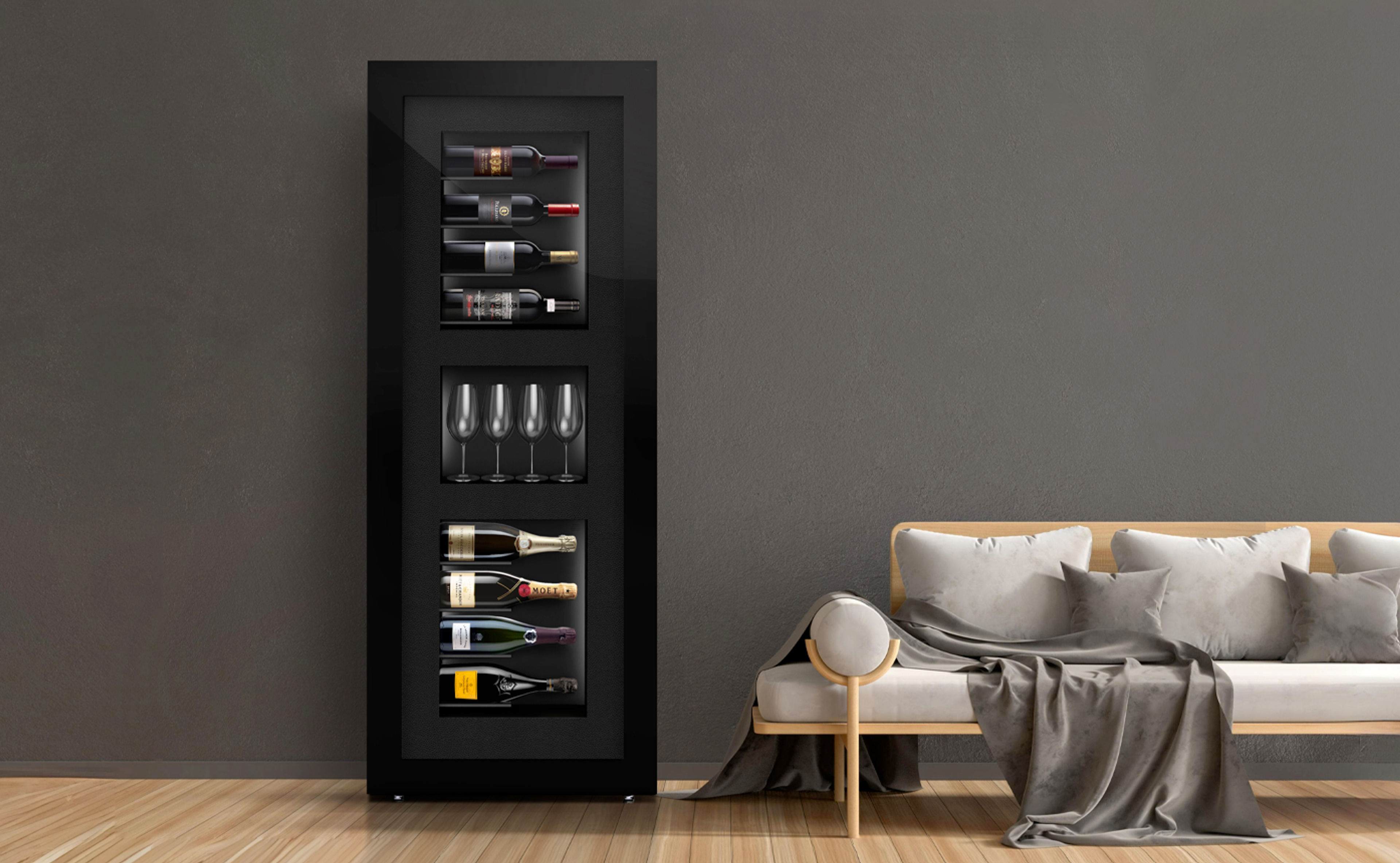 Quadro Vino er når design og teknologi går op i en højere enhed. Således skabes den første køleramme i verden = det væghængte vinkøleskab.