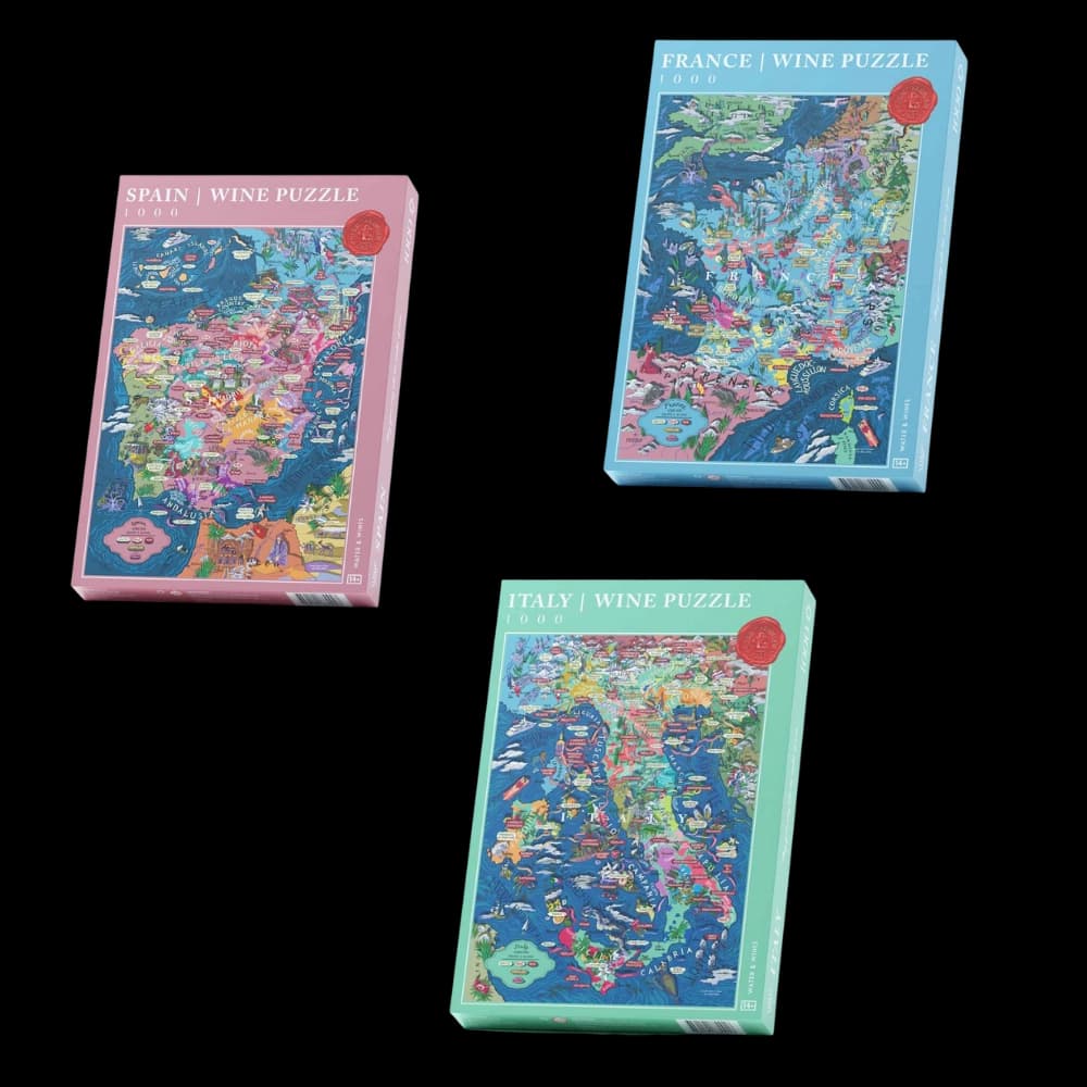Giv en uforglemmelig gave med vores eksklusive puslespilssæt, der præsenterer puslespil inspireret af de ikoniske vinregioner Italien, Frankrig og Spanien og bliv klogere på druesorter og vinbyer.