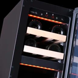 Dine flasker placeres på 4 bøgetræshylder, som oplyses af et smukt orange LED lys. Denne model fås med hyldeforkanter i bøgetræ, sort aluminium eller rustfrit stål. Du kan vælge din favorit her på siden.