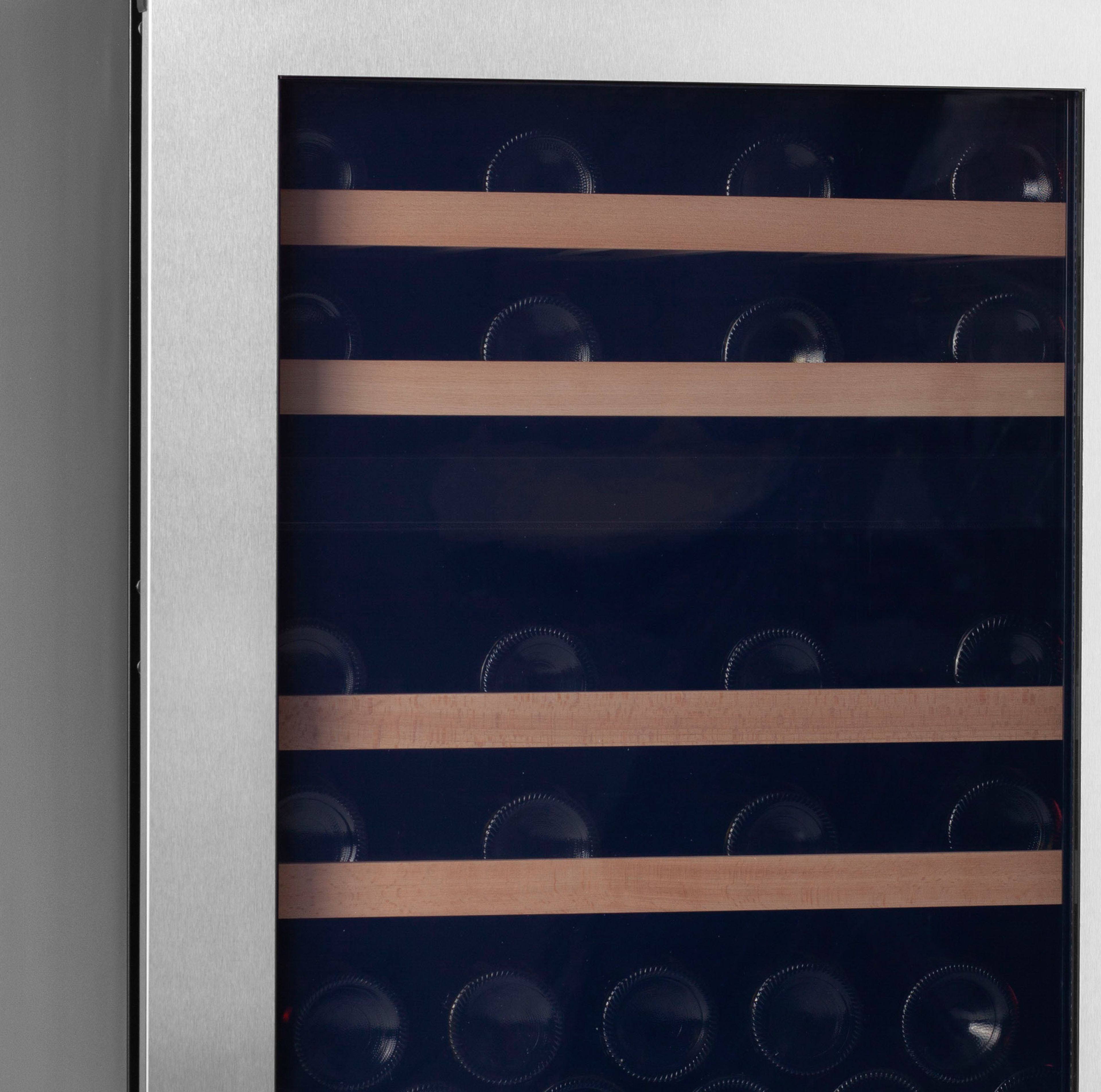 Dine flasker placeres på 11 normale fuldt udtrækkelige (80%) bøgetræshylder med tre led og 1 displayhylde, som oplyses af et smukt LED lys, der kan indstilles til enten hvidt, blåt eller orange. Denne model fås med hyldeforkanter i bøgetræ, sort aluminium eller rustfrit stål. Du kan vælge din favorit her på siden. Hvis du på et tidspunkt skulle få lyst til at skifte look på dit vinkøleskab, har du også mulighed for at tilkøbe nye hyldeforkanter separat. Du har herudover mulighed for at tilkøbe ekstra displayhylder, så du og dine gæster kan beundre dine allerbedste vine.
