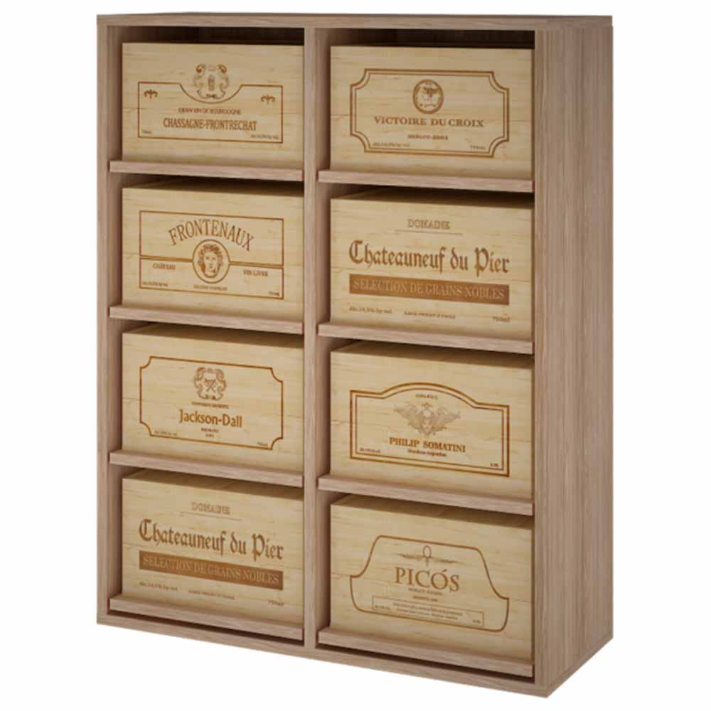 Elegant vinreol til 8 trækasser, tilgængelig i behandlet spansk fyrretræ, massiv eg eller sort, brun eller hvid-lakeret fyr. Opbevarer Bordeaux, Bourgogne og Champagne-flasker. Dimensioner: 82x32x105 cm. Leveres med justerbare fødder. Bemærk: Trækasser med vin medfølger ikke.